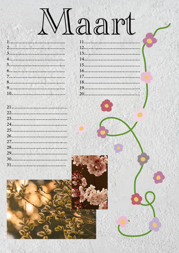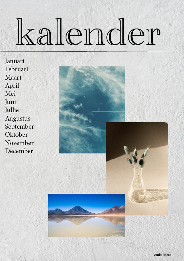 Dit was een opdracht die ik zelf heb bedacht. Ik wilde voor mijn opa en oma een kalender maken aangezien ze een nieuwe nodig hadden. Ik wilde een combinatie maken tussen foto’s en illustraties. Ik ben heel blij met het eindresultaat en ik vond het heel leuk om te doen. Mijn opa en oma waren er ook erg blij mee.