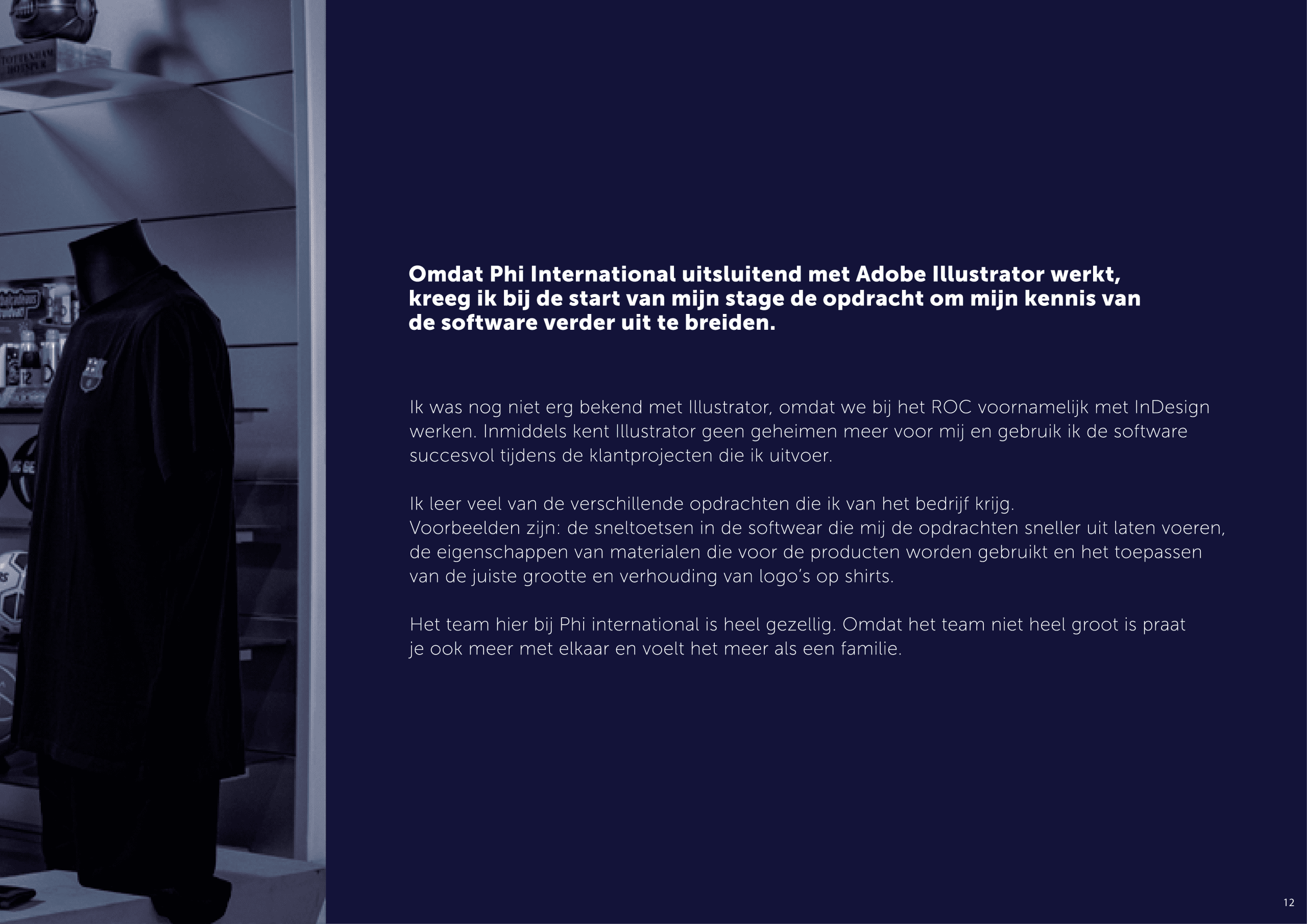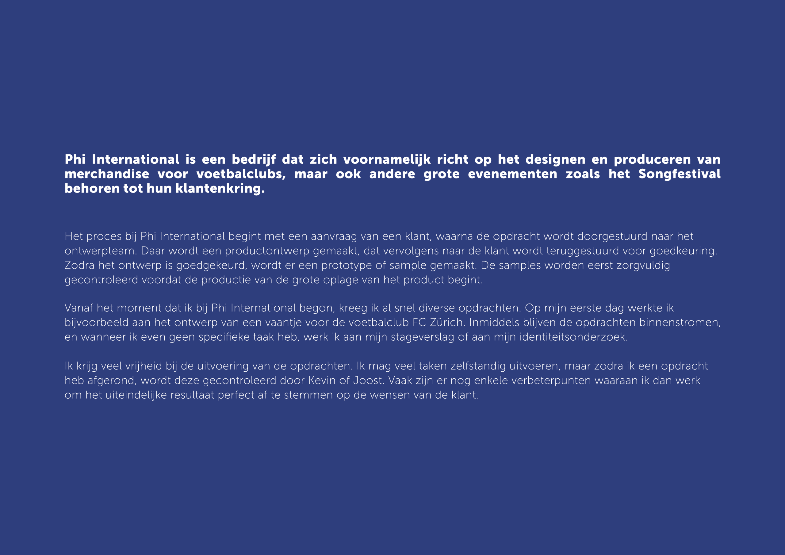 Ik heb stage gelopen bij Phi international. Ik heb stage gelopen van september 2024 tot februari 2025. Mijn tweede stage was van februari 2026 tot mei 2026. Ik heb heel veel op deze plek geleerd. Ik ben echt gegroeid als ontwerper en ik heb het erg naar mijn zin gehad.